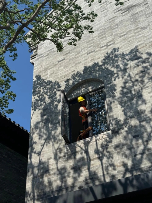 工人們正如同一支默契的交響樂團(tuán),精心地安裝著花窗,陽(yáng)光透過樹枝的縫隙,投下斑駁的影子,倒映在上面。他們以一顆辛勤的心,塑造著每一處風(fēng)景。