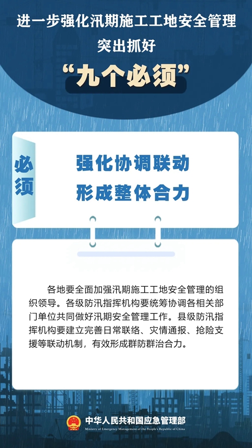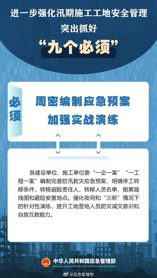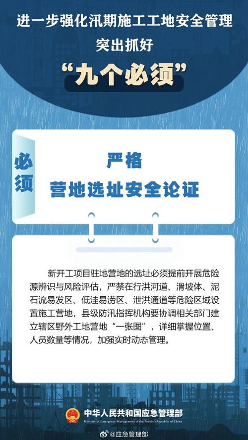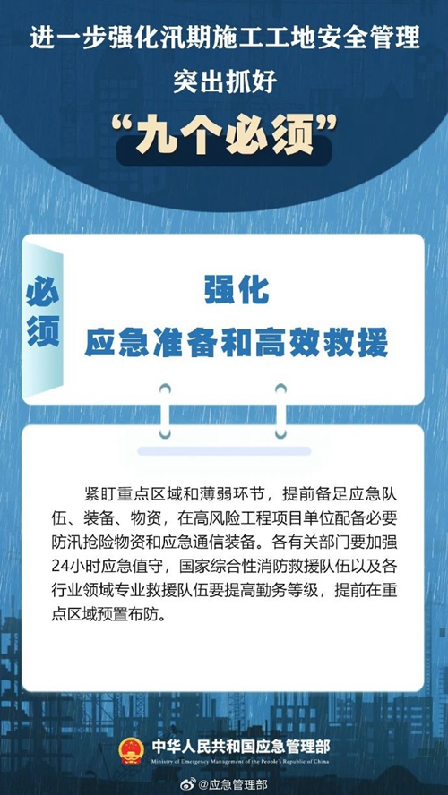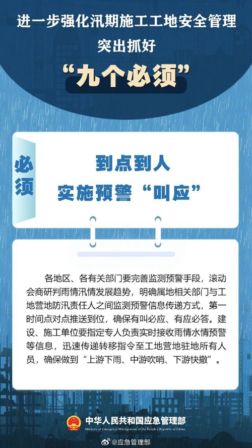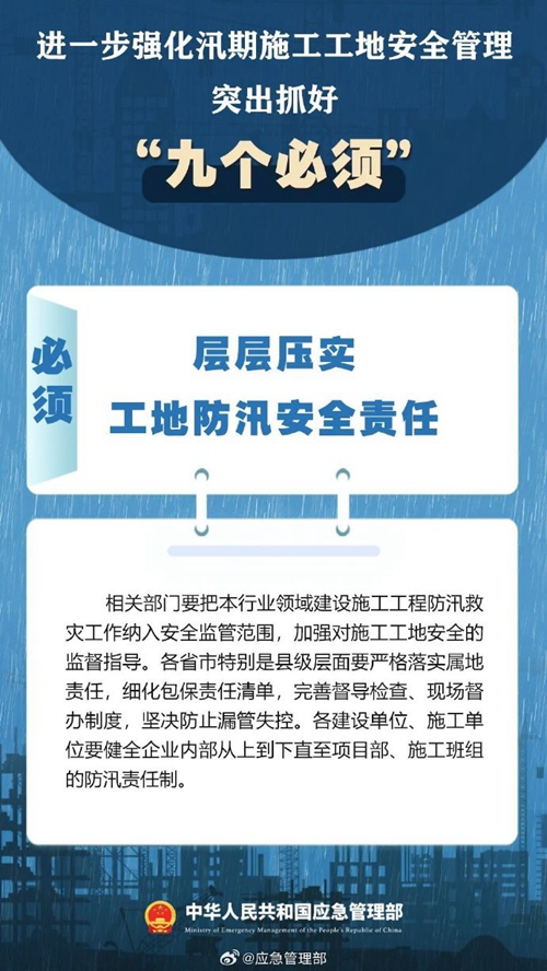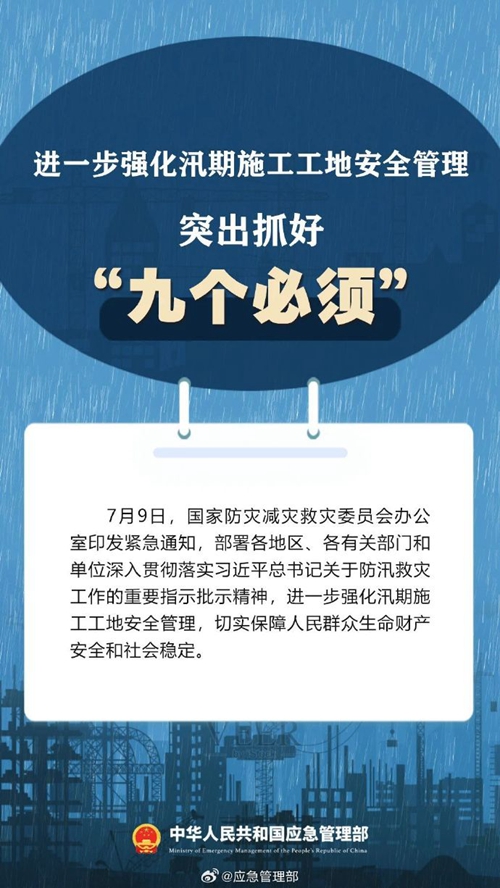 7月9日,國(guó)家防災(zāi)減災(zāi)救災(zāi)委員會(huì)辦公室印發(fā)緊急通知,進(jìn)一步強(qiáng)化汛期施工工地安全管理,要突出抓好“九個(gè)必須”↓↓ ???