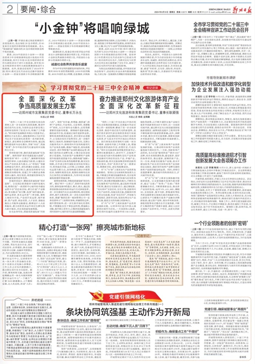 “黨的二十屆三中全會(huì)把深化國(guó)企改革納入進(jìn)一步全面深化改革戰(zhàn)略、推進(jìn)中國(guó)式現(xiàn)代化全局,為國(guó)有企業(yè)在新征程上改革轉(zhuǎn)型指明了前進(jìn)方向,明確了工作重點(diǎn)。”鄭州城市發(fā)展集團(tuán)有限公司黨委書(shū)記、董事長(zhǎng)萬(wàn)永生表示,城發(fā)集團(tuán)將以習(xí)近平總書(shū)記關(guān)于全面深化改革的一系列新思想、新觀點(diǎn)、新論斷和全會(huì)精神為指導(dǎo),通過(guò)戰(zhàn)略性重組和專(zhuān)業(yè)化整合,苦練“內(nèi)功”,筑強(qiáng)“筋骨”,爭(zhēng)當(dāng)中國(guó)式現(xiàn)代化建設(shè)鄭州實(shí)踐的主力軍。