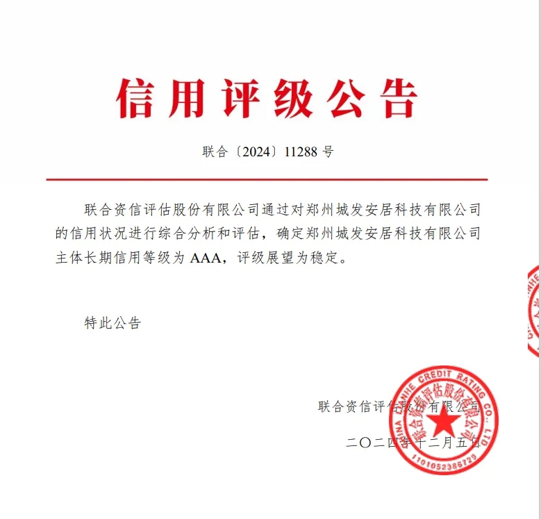 12月5日,鄭州城市發(fā)展集團(tuán)有限公司下屬子公司鄭州城發(fā)安居科技有限公司(以下簡(jiǎn)稱安居科技)順利取得AAA主體信用評(píng)級(jí),評(píng)級(jí)展望為“穩(wěn)定”,成功邁入國內(nèi)企業(yè)信用等級(jí)第一梯隊(duì)。