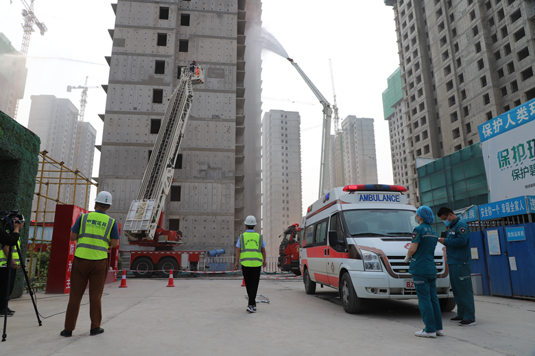 啟動儀式上,在工地現(xiàn)場開展了消防救援應(yīng)急演練。該環(huán)節(jié)模擬施工現(xiàn)場發(fā)生火災時,現(xiàn)場管理人員應(yīng)急操作反應(yīng)及配合市消防救援支隊展開滅火救援的案例。演練現(xiàn)場火災模擬真實生動,4部消防車、1部救援車、1部救護車實地奔赴現(xiàn)場開展滅火及救援。整個演練過程現(xiàn)場組織嚴密、人員到位快速、操作程序得當,達到了預期效果。宣誓環(huán)節(jié),由中建二局三公司代表引領(lǐng)各參賽單位代表共同開展安全宣誓。趙新中為各參賽單位授旗。
